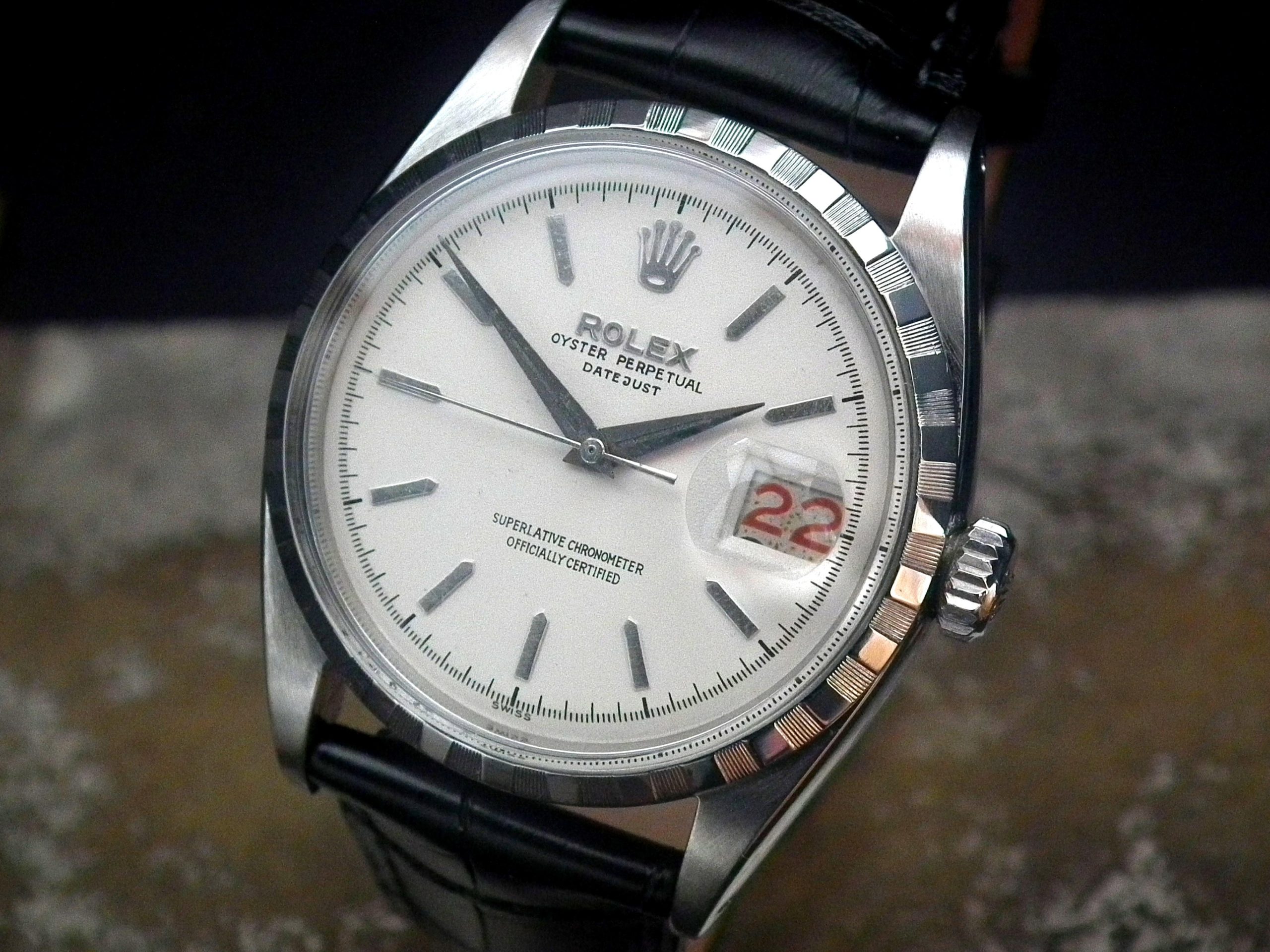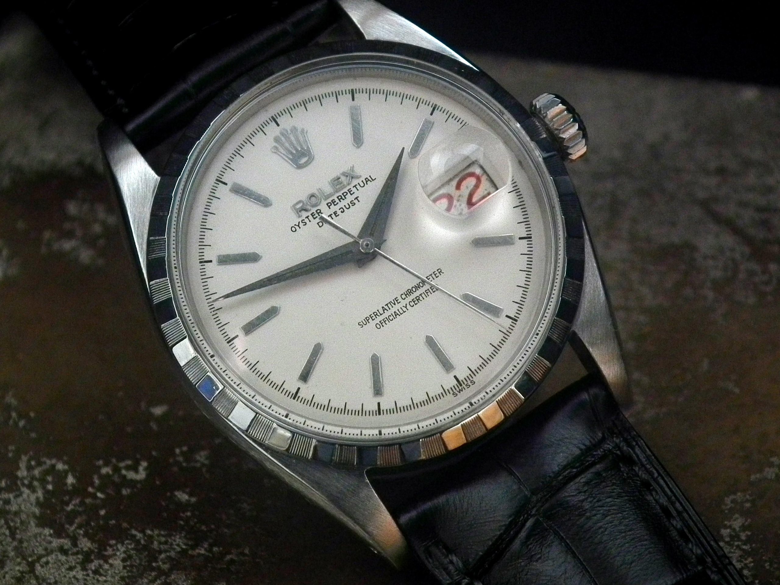 This is a wonderful example of one of the earliest Rolex Datejusts (introduced in 1945). The solid steel case is in excellent condition with only the most minor signs of wear. The original Rolex signed crisp white dial has been professionally refinished or cleaned a few years ago and is stunning. The raised steel hour batons and original steel dagger hands provide a soft contrast to the dial and are perfectly framed by the early engine turned steel bezel. Being a Roulette date the colours alternate between black and red. The very rare Rolex signed 1065 ‘Butterfly’ automatic movement is again in excellent condition and has just been fully serviced by our professional watchmaker – please note, whilst in excellent condition it will need winding once or twice a week even with regular wear.