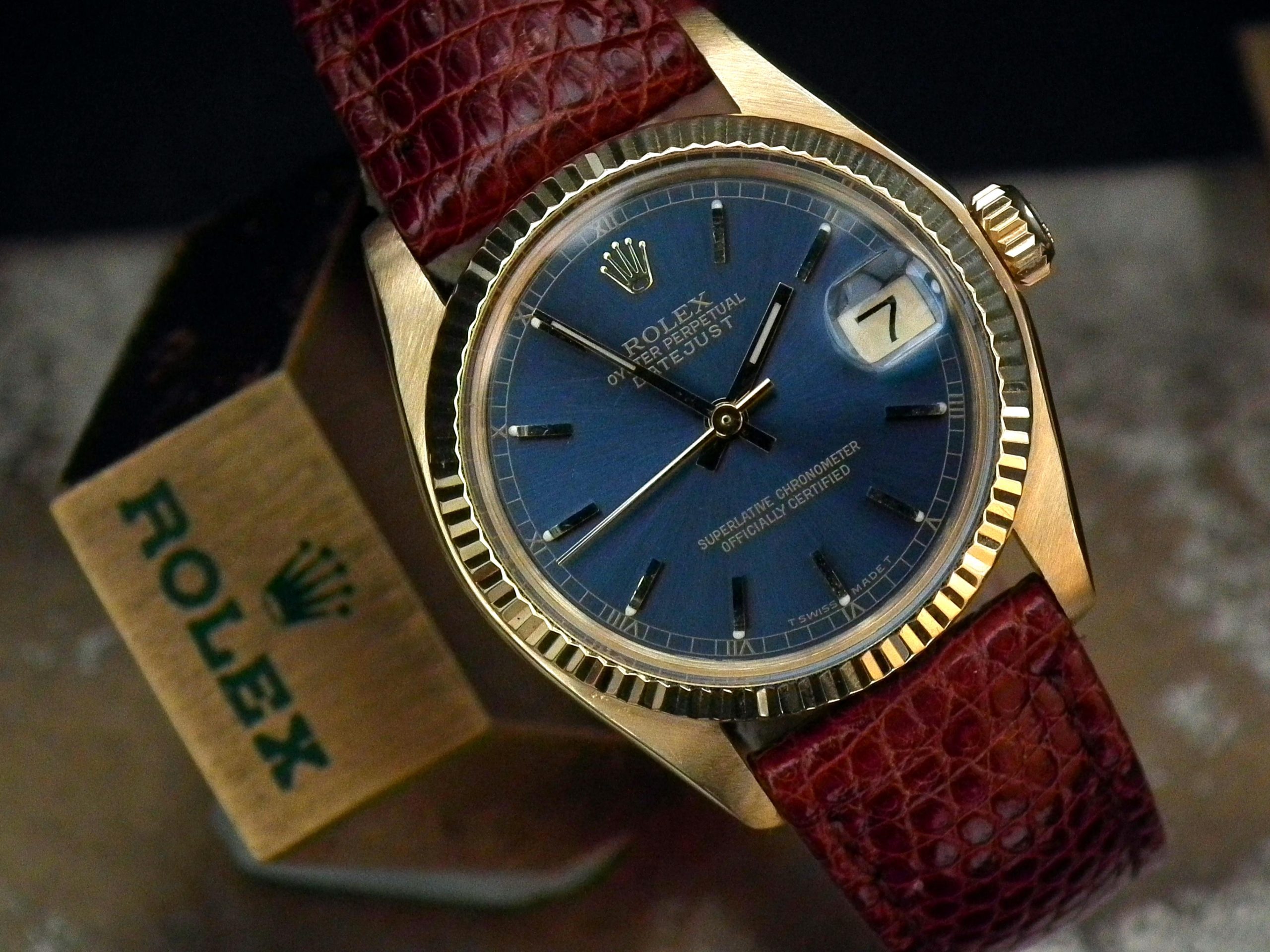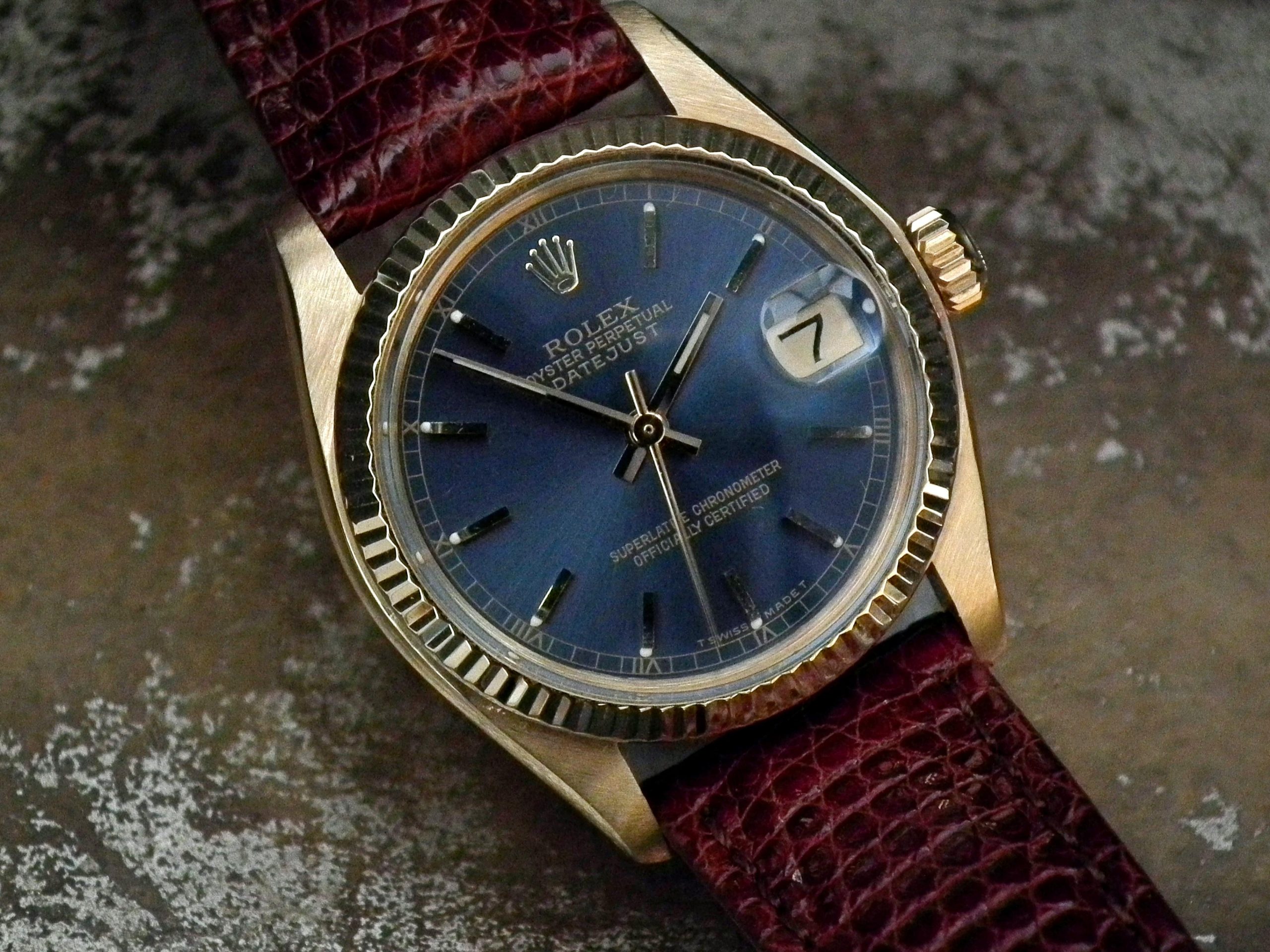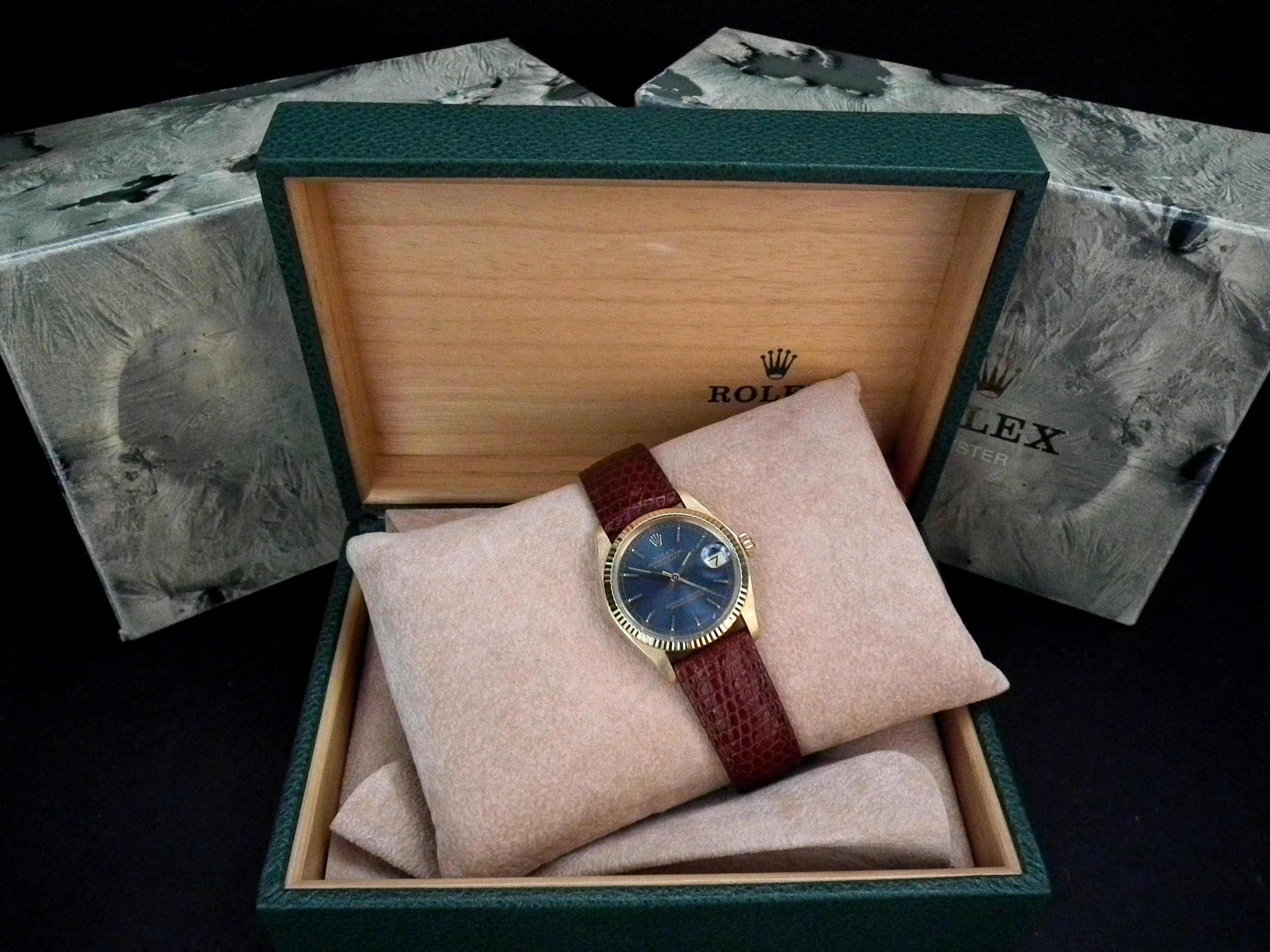 This is a stunning example of the iconic mid-size Rolex Datejust from 1979. The solid 18ct yellow gold is in overall excellent condition with some minor surface scratches. The original and beautiful dark blue pearlescent Rolex dial is again in excellent condition – the yellow gold hands and fluted bezel provide a lovely contrast. The very high grade Rolex signed chronometer standard automatic movement is again in excellent condition and was fully serviced by the Rolex approved watchmaker Stephen Hale so has their 2 year guarantee to 31/1/27 – we’ll provide a balance for the full year. The watch sits on a brown lizard skin strap which is in very good condition – very rarely it also has a genuine solid 18ct yellow gold Rolex buckle (£650 or so)… In terms of provenance we have: