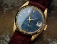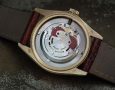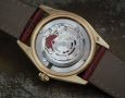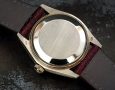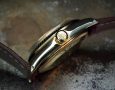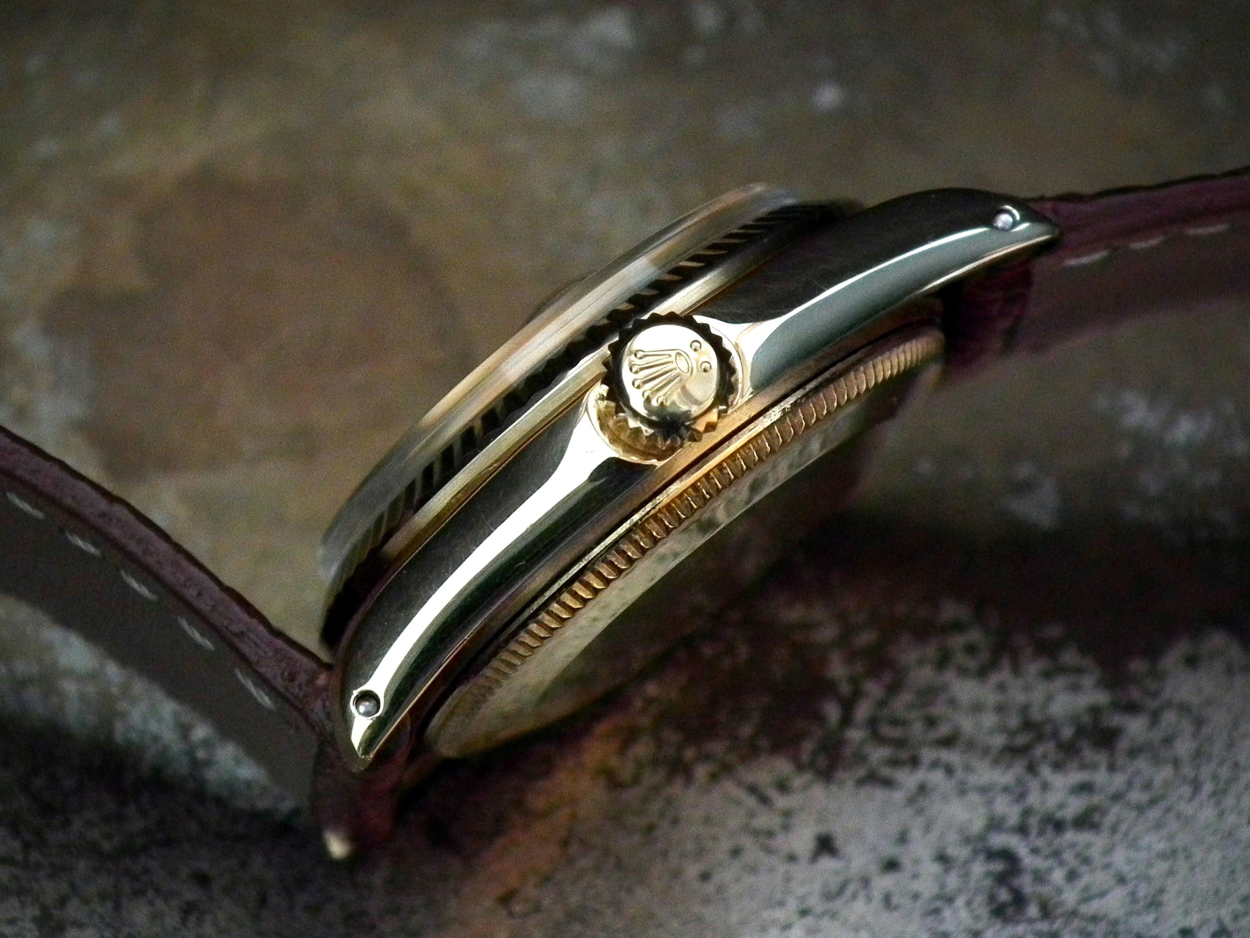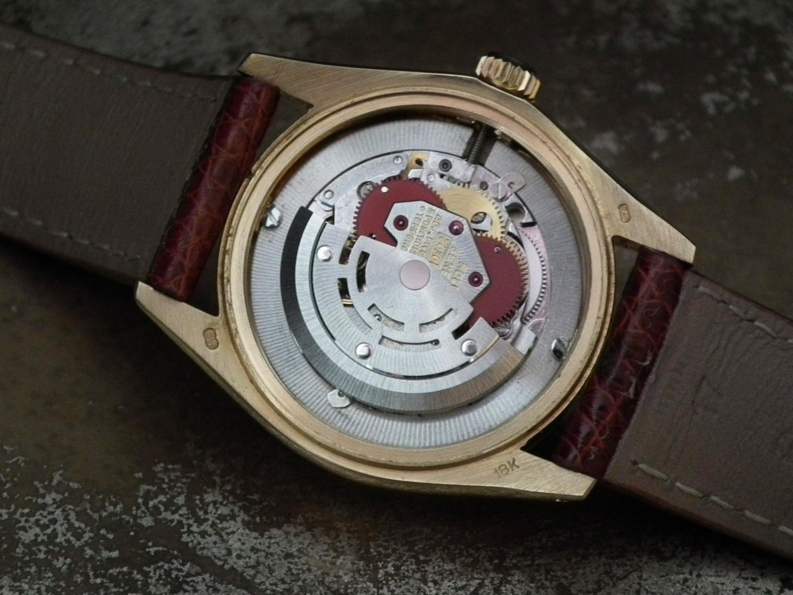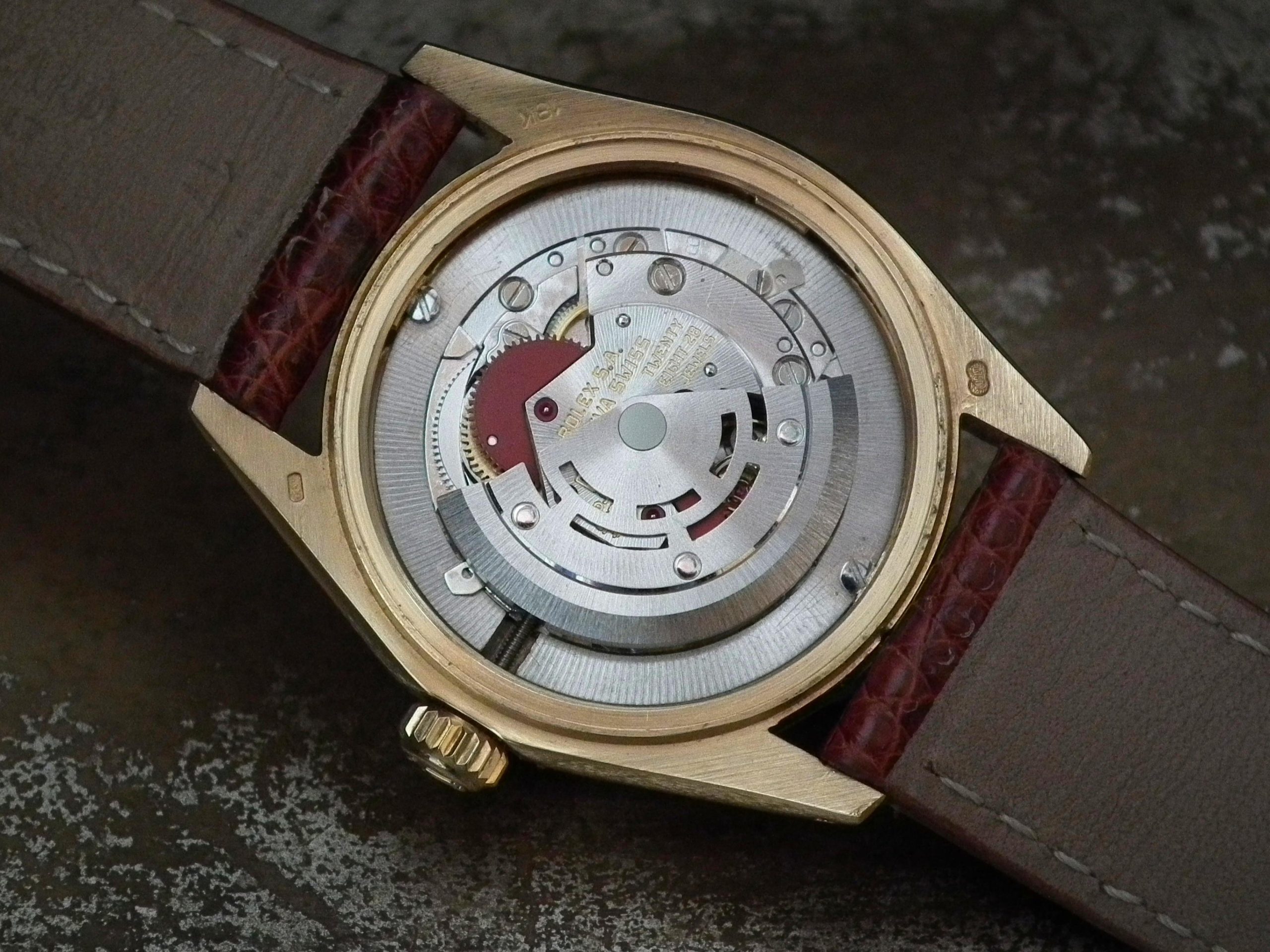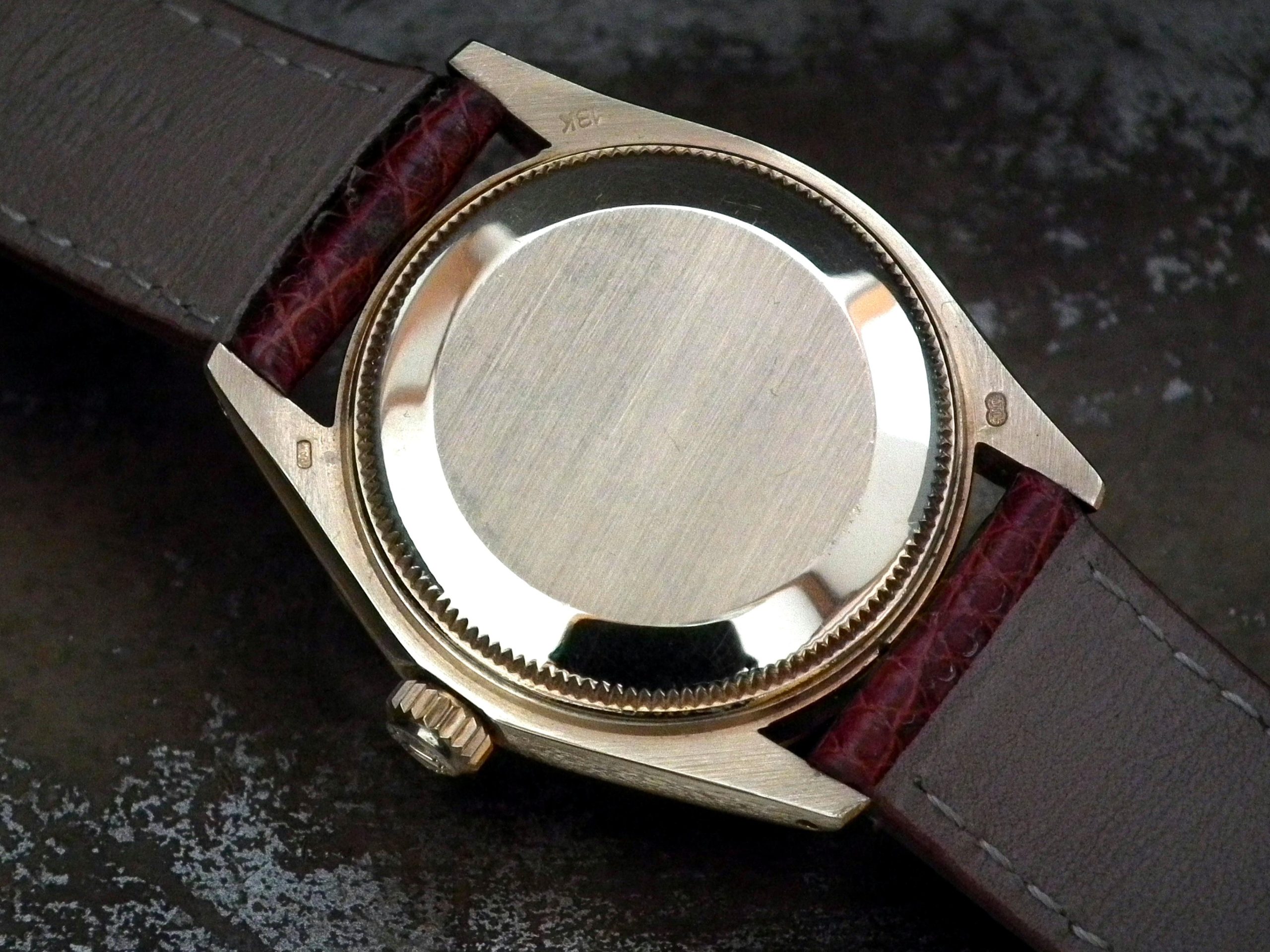 The solid 18ct yellow gold is in overall excellent condition with some minor surface scratches. The case measures 31mm across, excluding the Rolex crown and 36mm long including the lugs. The inside case is signed ‘Montres Rolex SA Geneva Switzerland Patented’, ‘6800’ and it has the appropriate hallmarks for solid 18ct gold.
