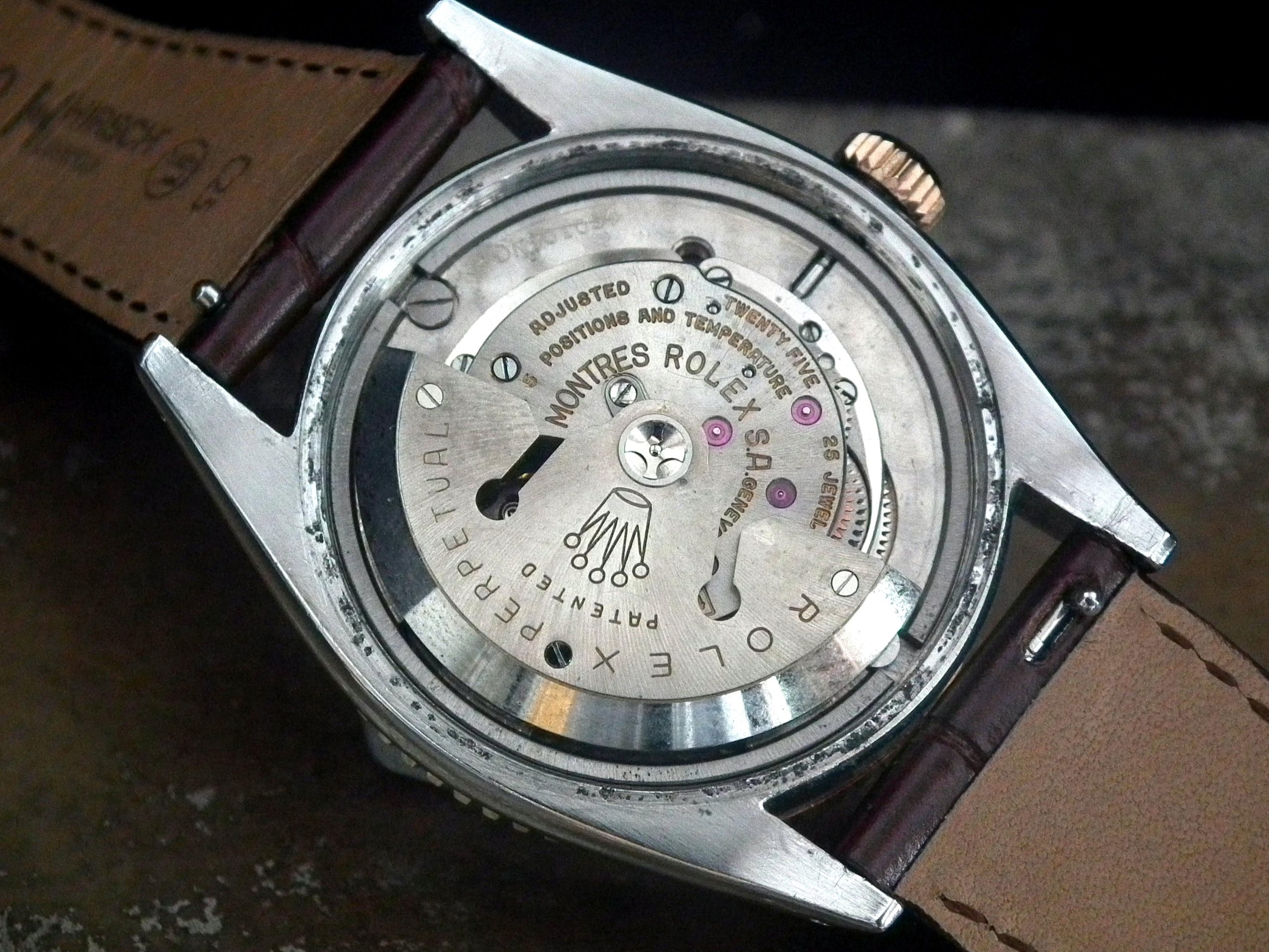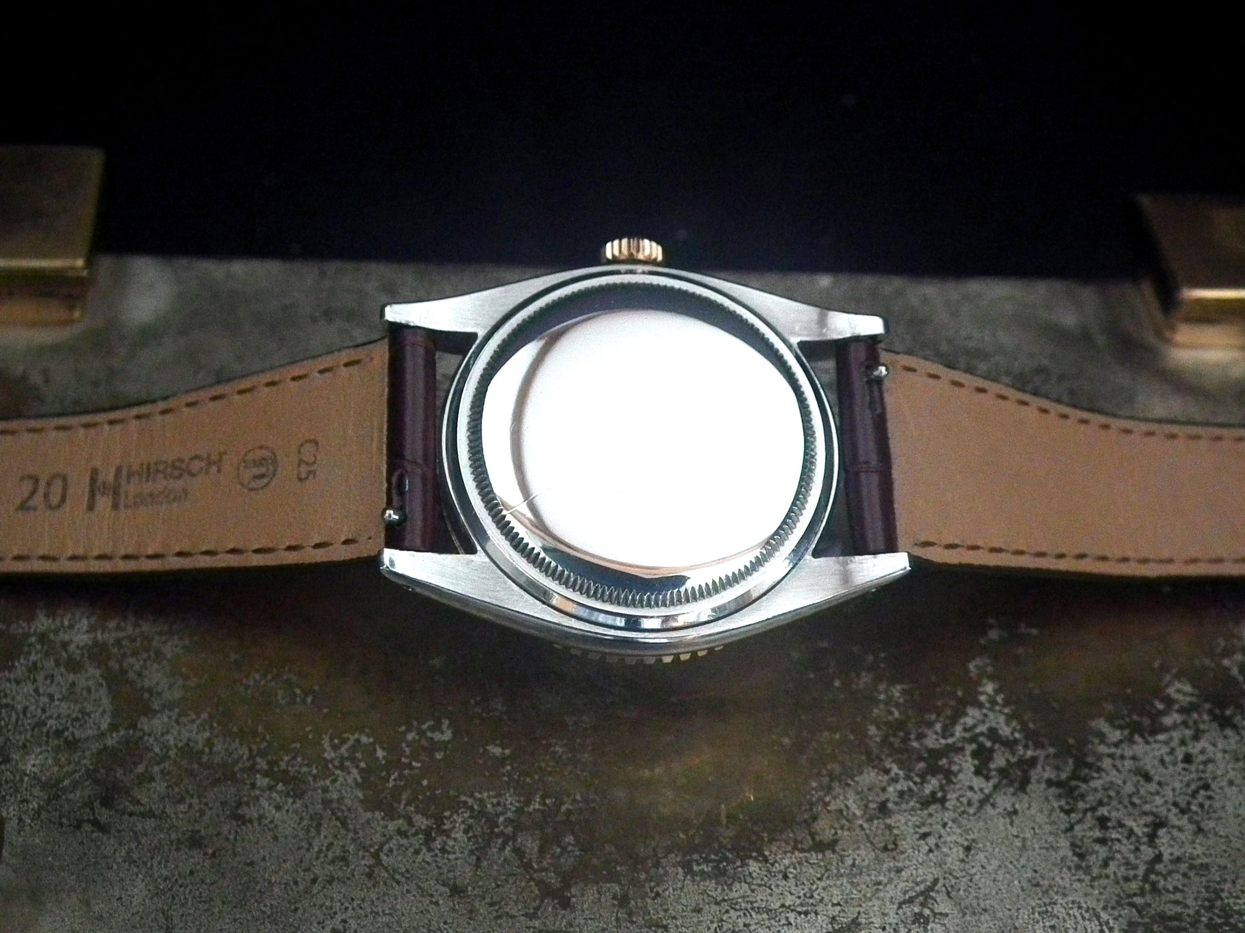 This example was made in 1959 and the steel and solid gold case is in excellent condition with only minor signs of wear. The original Rolex signed pearlescent champagne dial is in excellent condition and looks stunning – I’ve tried to capture it on the photographs but would be happy to send a WhatsApp wrist video if required. The original Rolex signed ‘1066’ ‘Butterfly’ automatic movement is again in very good condition – watches of this age will require winding once or twice a week but the automatic movement does still charge it with wear. The watch sits on a new, super high quality, dark brown Hirsch ‘London’ alligator strap with Hirsch buckle.