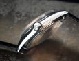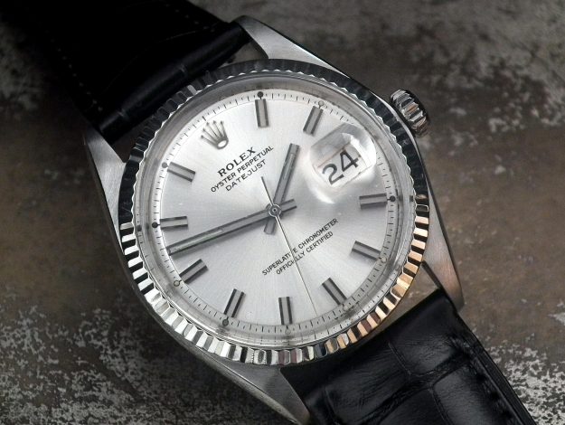 This is a beautiful example of the iconic Rolex Oyster Datejust from 1970. The solid steel and solid gold (fluted bezel) case is in near faultless condition with only the most minor signs of wear. The original and rare steel pearlescent dial with ‘Wide Boy’ batons is again in very good condition with only the most minor signs of age. The original Rolex signed ‘chronometer’ standard automatic movement is also in excellent condition and has just been fully serviced by our professional watchmaker. The watch sits on a new, super high quality, black Hirsch ‘London’ alligator strap with Hirsch steel buckle.