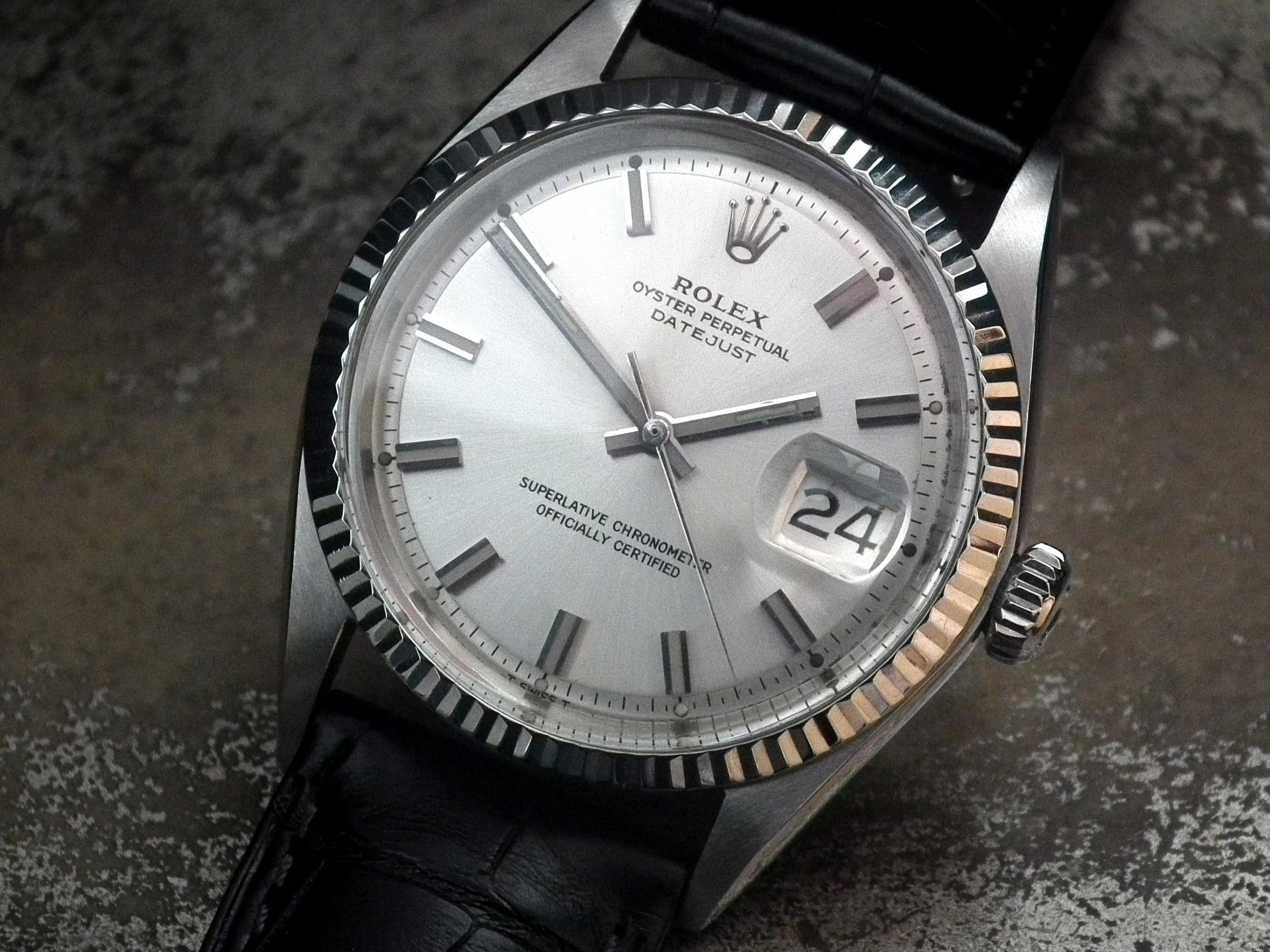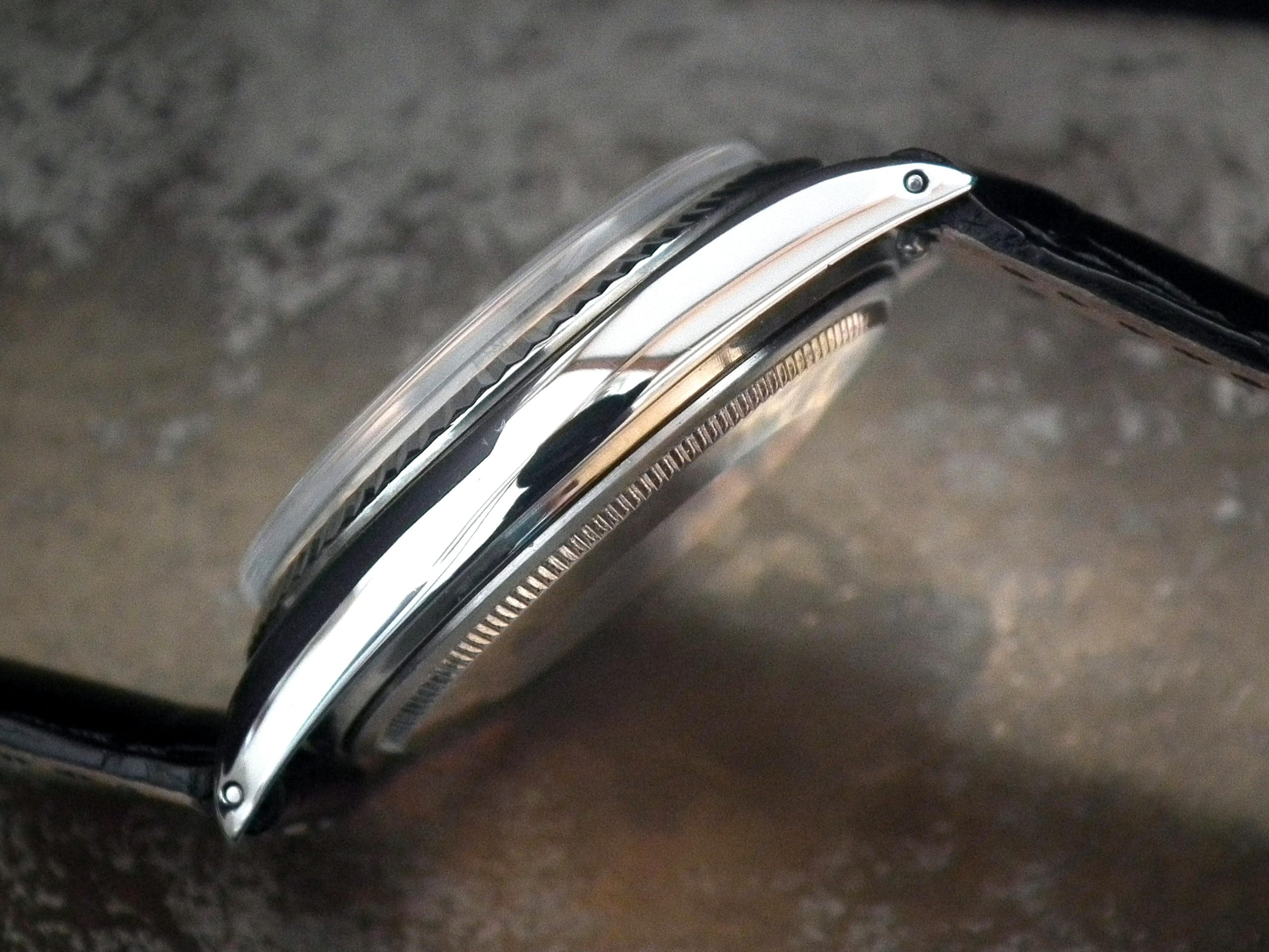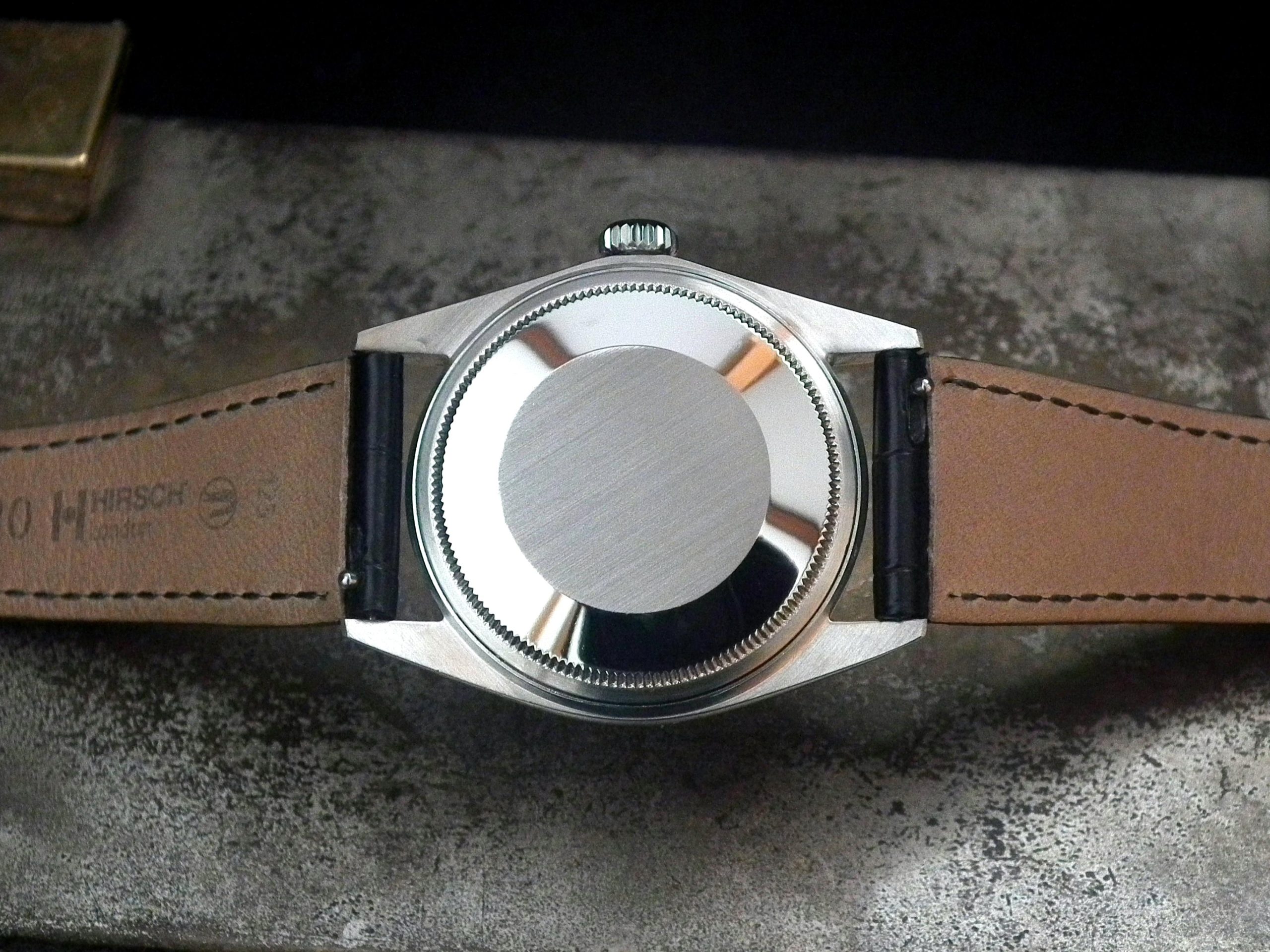 This is a beautiful example of the iconic Rolex Oyster Datejust from 1970. The solid steel and solid gold (fluted bezel) case is in near faultless condition with only the most minor signs of wear. The original and rare steel pearlescent dial with ‘Wide Boy’ batons is again in very good condition with only the most minor signs of age. The original Rolex signed ‘chronometer’ standard automatic movement is also in excellent condition and has just been fully serviced by our professional watchmaker. The watch sits on a new, super high quality, black Hirsch ‘London’ alligator strap with Hirsch steel buckle.