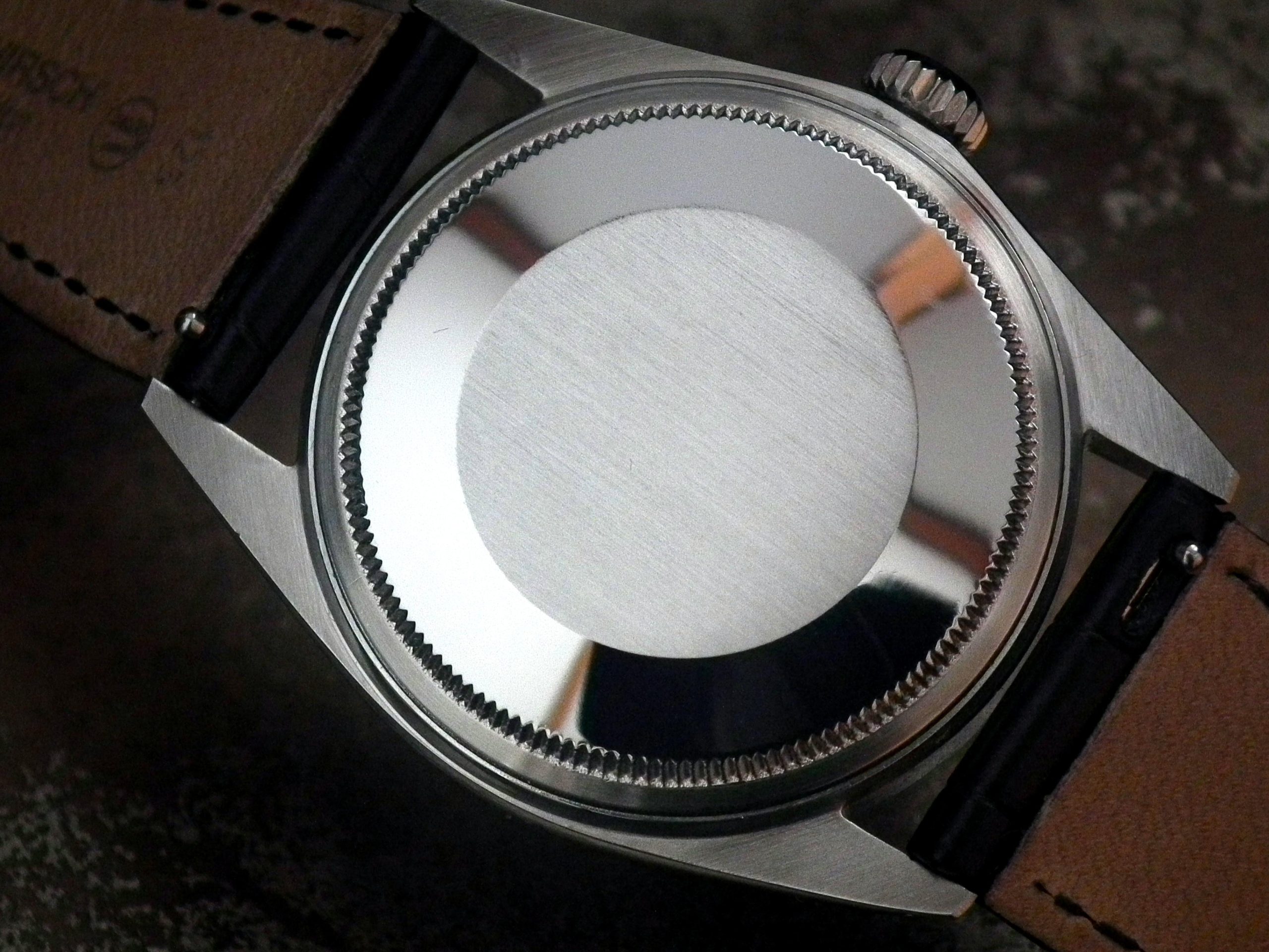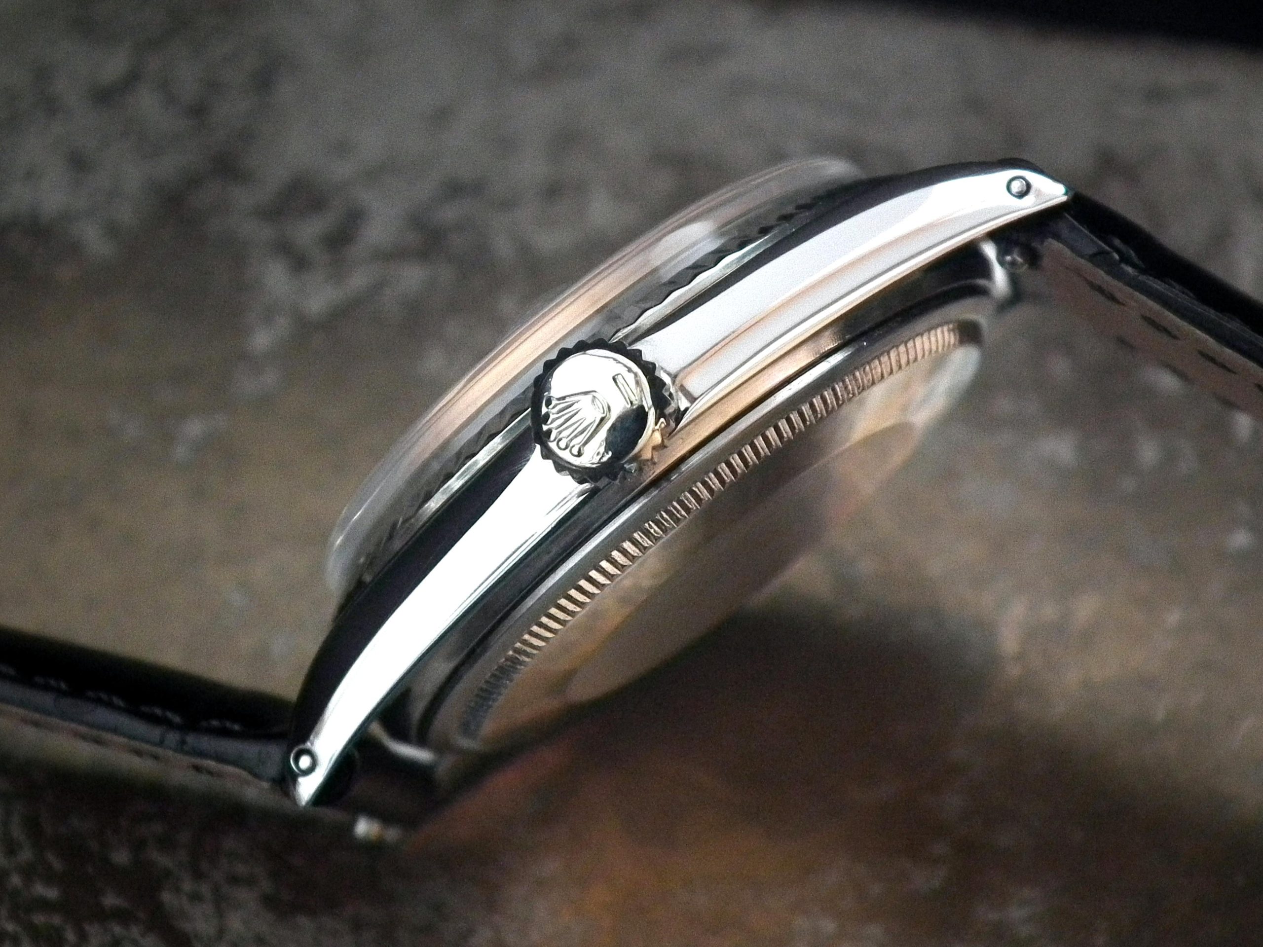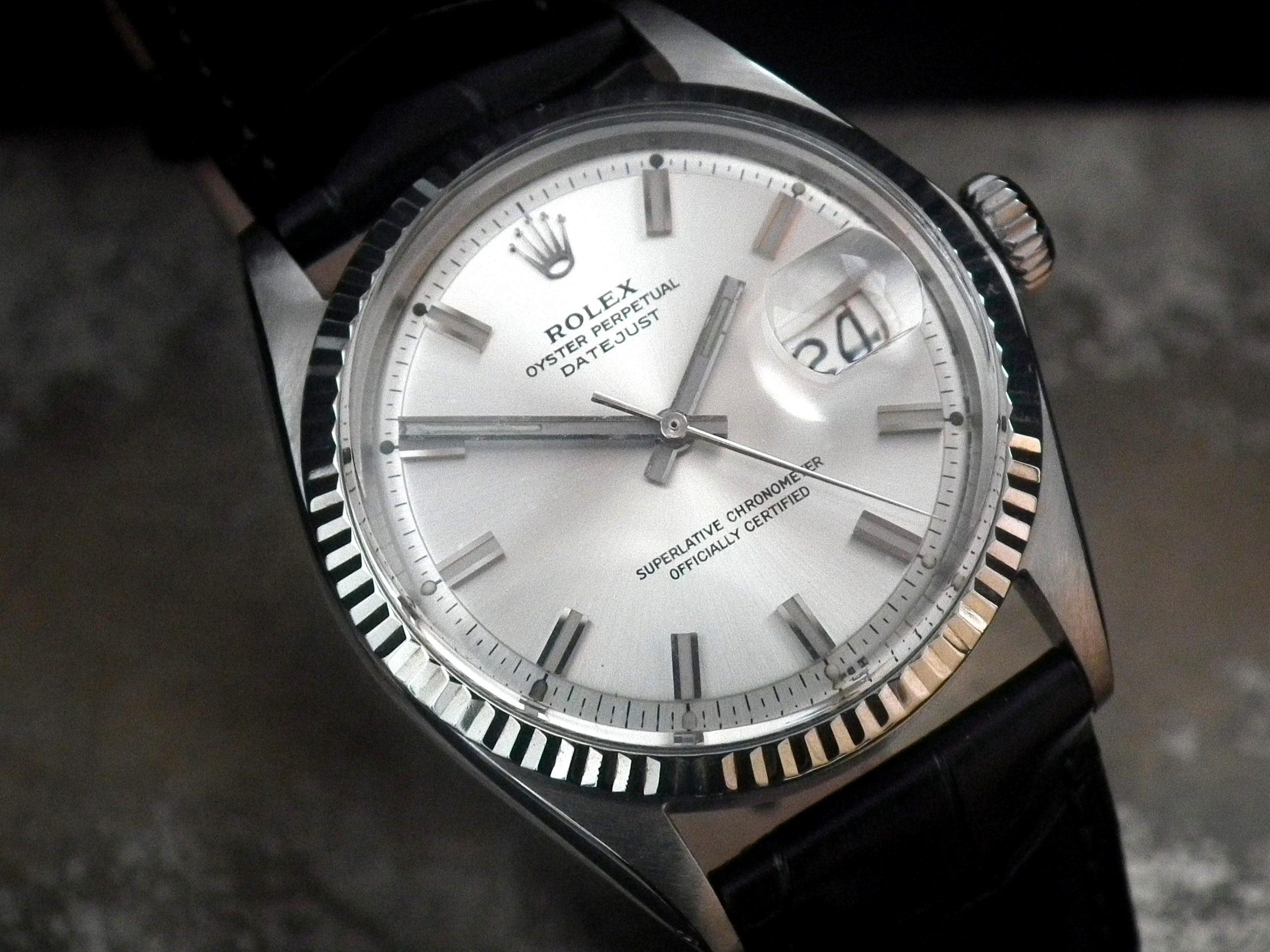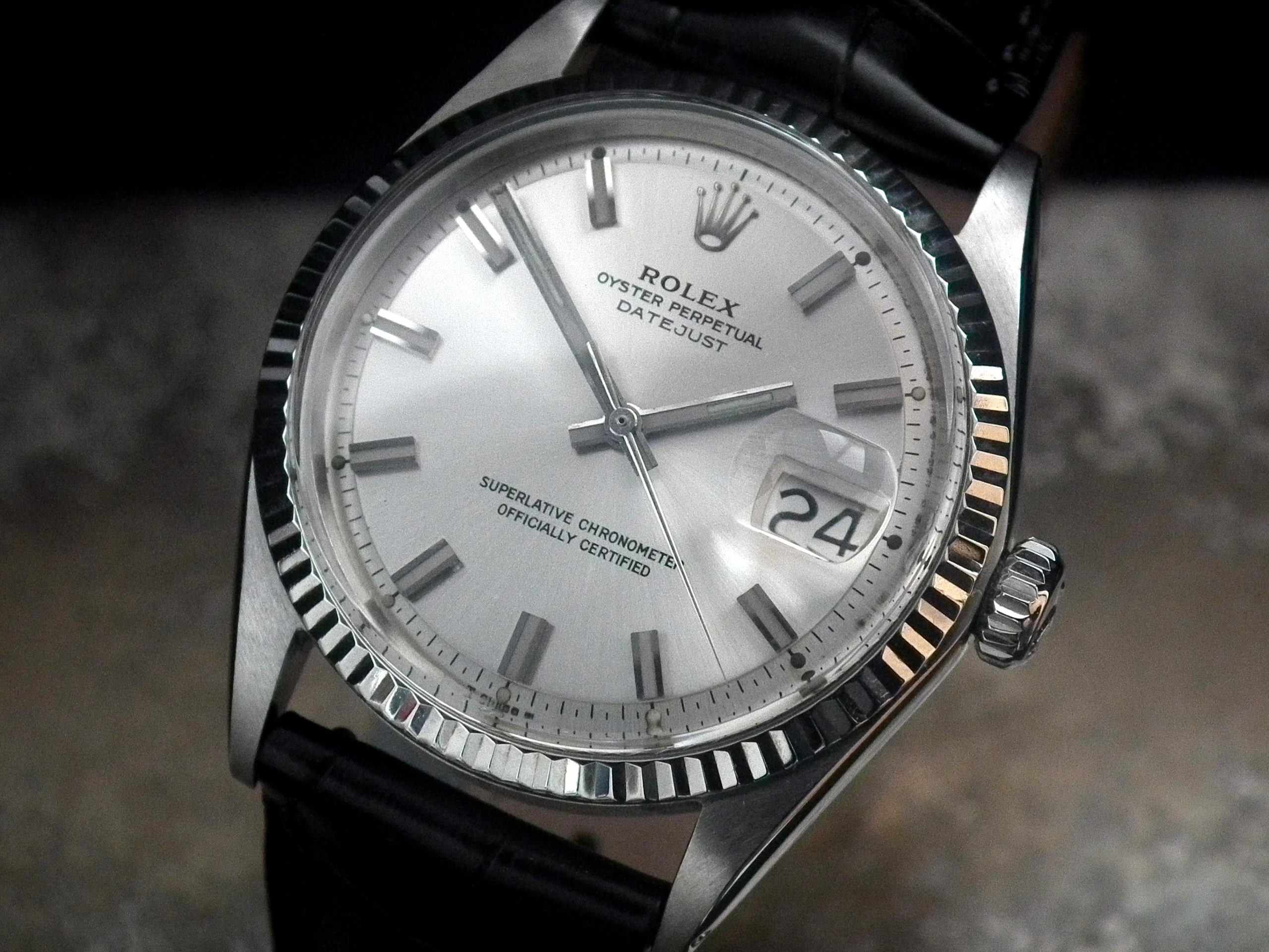This is a beautiful example of the iconic Rolex Oyster Datejust from 1970. The solid steel and solid gold (fluted bezel) case is in near faultless condition with only the most minor signs of wear. The original and rare steel pearlescent dial with ‘Wide Boy’ batons is again in very good condition with only the most minor signs of age. The original Rolex signed ‘chronometer’ standard automatic movement is also in excellent condition and has just been fully serviced by our professional watchmaker. The watch sits on a new, super high quality, black Hirsch ‘London’ alligator strap with Hirsch steel buckle.