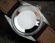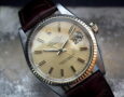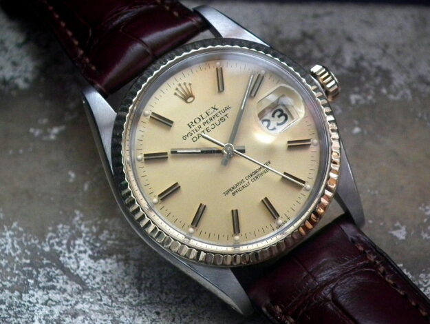 This is a beautiful example of the iconic Rolex Datejust from 1981. The steel and solid yellow gold (fluted bezel) is in excellent condition with only the most minimal signs of wear. The Rolex signed champagne slightly pearlescent ‘wide boy (larger batons) dial is again in excellent condition. We’ve also used Steven Hale Watch Restoration to replace the hands with new Rolex hands (we’ve kept the originals) and do a full service (£800+) which comes with their 2 year guarantee. The very high grade chronometer standard Rolex signed automatic is in excellent condition and has just been fully serviced by our professional watchmaker. The watch sits on a super high quality dark brown Hirsch ‘London’ alligator strap with a Hirsch gold plated buckle. We’ve also had the Rolex signed crown, stem and tube replaced with genuine Rolex parts. Very rarely we have the original paperwork and box along with the brochure, leather wallet and chronometer chip – as few as 1 in 50 watches of this age have this. It’s also the quick date set model that allows the date to be changed without going round the dial twice.