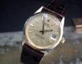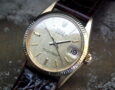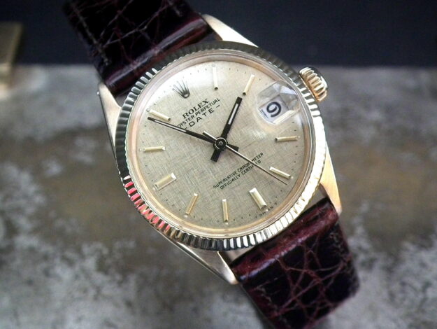 This is a beautiful example of the extremely rare mid-size ladies Rolex Datejust from 1965. The solid 18ct yellow gold case is in excellent condition with only the most minor signs of wear. The original Rolex signed champagne textured dial is in excellent condition and may have been refinished (we guarantee it’s genuine Rolex). The very high grade Rolex signed automatic movement is again in excellent condition and has just been fully serviced by our professional watchmaker. To complete this beautiful watch I’ve added a new, dark brown Hirsch crocodile skin strap. We hold the Hirsch franchise so can order any colour/material strap if you prefer.