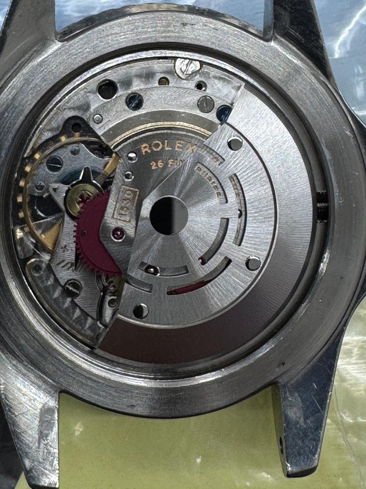 Made in 1965, the solid steel case is unpolished and has a number of scratches and marks on the case sides and case back. The original and untouched dial is stunning. Aged to a tropical dark brown with some lume plots showing as orange and some in a very light green – most dials from this period are replaced or refinished and whilst this one does show its age it’s got real charm. They have domed ‘tropical’ lens which makes it difficult to capture the colours so I’ve taken a WhatsApp video and if you’d like a copy please advise your number. The movement (pictures taken at Steven Hale) is in excellent condition and has just a full service from Steven Hale Watch Restoration so comes with their 2 year guarantee. SHWR have also put a new, genuine Rolex bracelet on the watch (total cost of service and bracelet is £1,980.00).